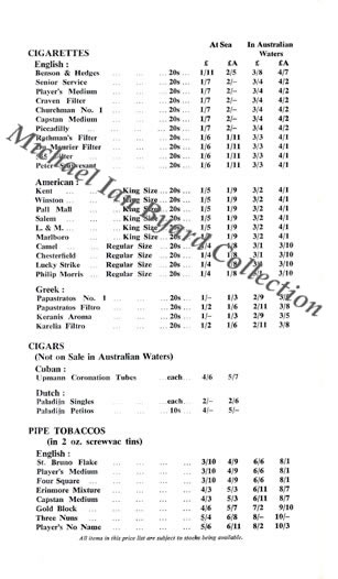 ![]() Ellinis Bar List, circa 1970s showing cigarette, cigars and pipe tobacco prices, notice how cheap they were! |
