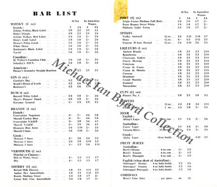 This Ellinis Bar List, inside pages at left, circa 1970s, is interesting because it shows, in the first place how cheap the drinks were on board. Secondly it is very noticeable that when in Australian waters Australian prices HAD to be charged. In those days, of course, drinks at sea were Duty Free. It will also be noticed thast cigars were "Not on Sale in Australian Waters". |