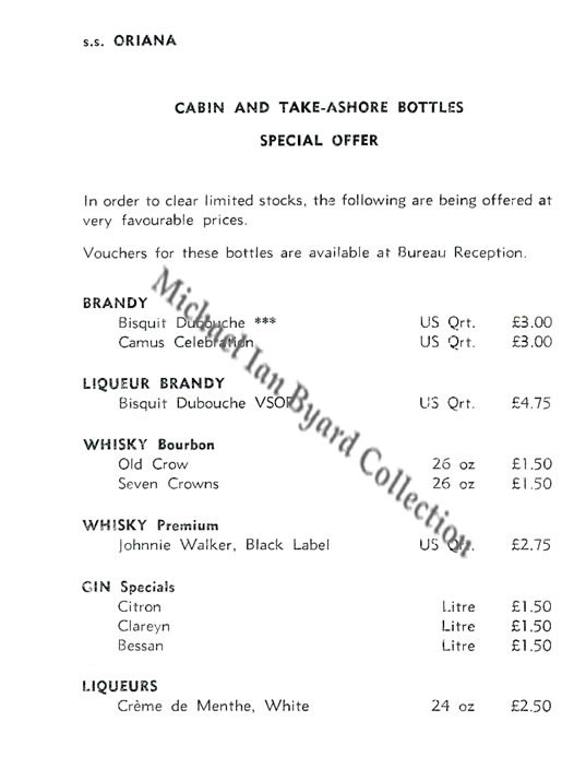![]() Bar List showing a special offer for spirits and liqueurs which were available at "very favourable prices" |