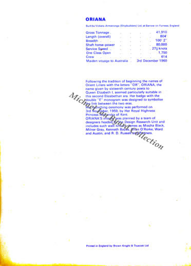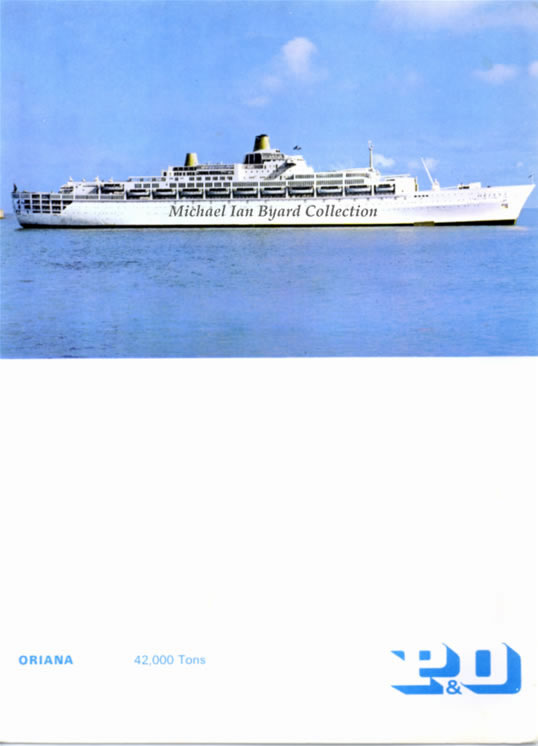 Oriana 1960 Oriana was built by Vickers-Armstrong at Barrow-in-Furness, England and was launched on 3rd November 1959 by Her Royal Highness Princess Alexandra of Kent. Oriana sailed on her Maiden voyage to Australia on 3rd December, 1960. Her Length overall was 804 feet, Breadth 100 feet 2 inches, Gross Tonnage 41,910, Shaft horse-power of 80,000 giving her a Service Speed of 27.5 knots. Originally built as a two class vessel to carry 1,750 passengers and 614 crew. When P&O secured the remaining shares of Orient Line, in 1960, she became part of the new joint company P&O - Orient Lines of Australia, which soon became P&O only. All the companies vessels were then redesignated as One-Class. This collection of menu cards dates from Various days in June 1976. The information about each illustration appears on the back cover of each card. |