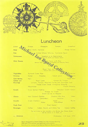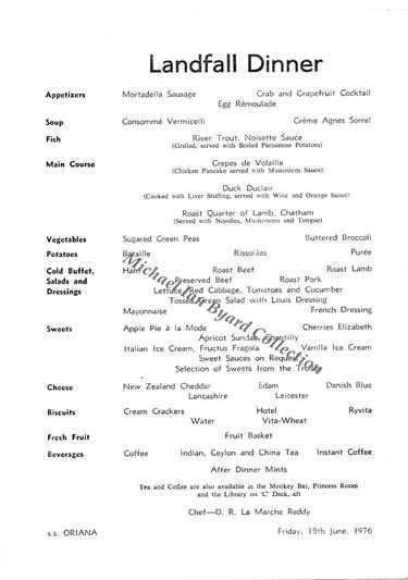 ![]() Landfall Dinner Menu for 18th June: Depicting S.S. Oriana at sea. |