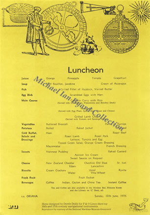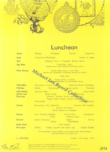 ![]() Luncheon Menu for 11th June: The card was designed for P&O by Dorrit Dekk and depicts 16th and 17th Century navigational instruments. |