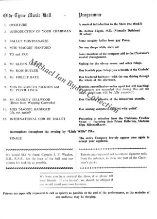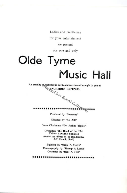 ![]() ![]() The Programme for the "Old Tyme Music Hall" evening showing humerous descriptions of the various acts. |