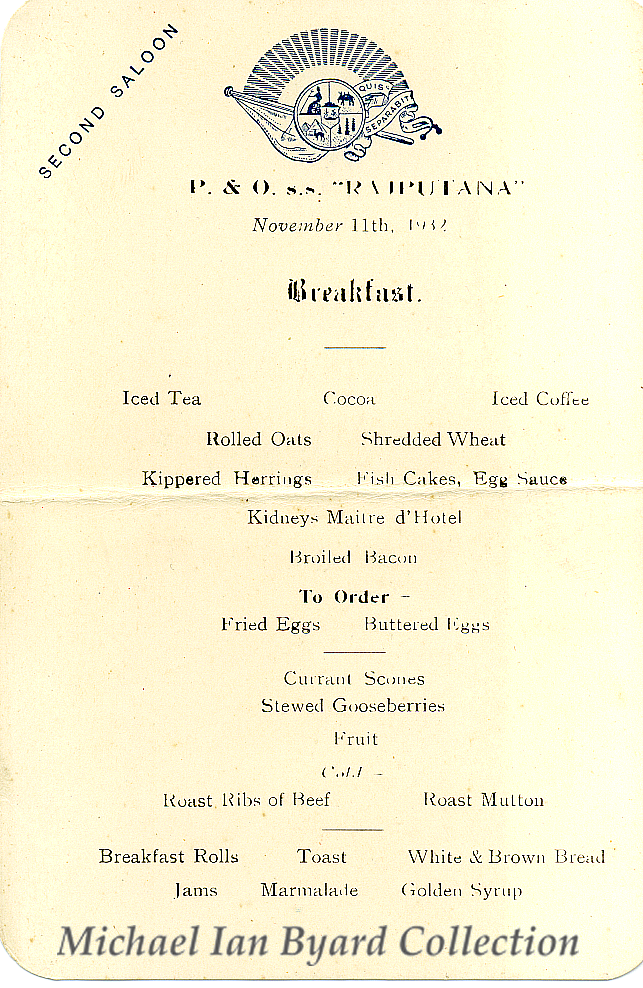 and O Rajputana, ( postcard at left) Second Class Saloon breakfast menu dated November 11th, 1932. Notice the somewhat frugal choice available when travelling Second (Tourist) Class |