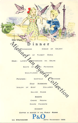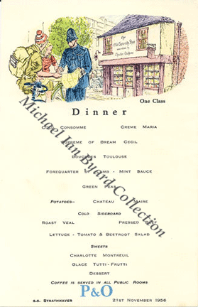 The above consecutive Dinner Menus show the range of food available aboard "Strathnaver" in 1956 by which time she, and her sister ships, had become One Class vessels. The illustrations were part of a series of 'themed' menus depicting famous London landmarks, that on the left "Trafalgar Square" and, on the right, Charles Dicken's (supposed) "The Old Curiosity Shop". (Michael I. Byard collection) |