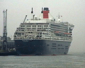 forward QM2 is pictured at what will now become her Home berth, having arrived in the morning at the conclusion of her Maiden Voyage to the USA which started on Monday 12th January, 2004. Michael Byard Collection |