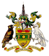 In the case of Noble and Corporate Arms, the achievement consists, in the main, of five main sections: (1) The Shield, the most important part, without which there would be NO arms; and upon which the ‘charges’ are shown; (2) The Helm, (or helmet) which displays the ‘Crest’, and surmounts the shield and is usually shown ‘affronte’ or facing the onlooker; (3) the Supporters - which are placed on either side of the shield to support it; (4) the Mantling, the stylised silk ribbons which flow from the crest and helmet and are usually, but not always, of the same colour as the main colours on the shield; (5) the Compartment, upon which the shield and supporters stand and in front of which, if requested by the grantee, a Motto can be shown. Armorial Bearings for ‘Gentlemen’, i.e. not members of the Nobility, do not have supporters and the Helm is shown facing to the observers ‘left’ (see the example of Personal Arms above) | |