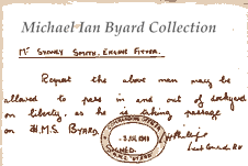 HMS Byard was a 'Captains Class' Frigate given to the Royal Navy under the USA 'Lend-lease' programme.She displaced 1300 tons and was 290 feet in length, with a beam of 35 feet. Launched on 6th March, 1943 she was completed early 1944, after service in England she returned to the USA on 1st January 1946 for scrapping.This copy of a leave pass was sent to Michael Byard in the 1970s. | ||
