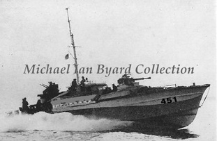 Built by British Power Boat Company of Hythe, Southampton, designed by Hubert Scott-Paine,(1890 - 1954) she was originally laid down as a Motor Gun Boat and given the number 132, however she was re-designated whilst being completed to that of Motor Torpedo Boat 451. After the war she was bought by Edward (Jack) and Mavis Byard and converted into a houseboat on the Lymington River, in Hampshire. (Click on MTB 451 below.) |